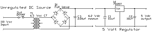 Lets take a minute and talk about the nuts and bolts of making projects. The TICkit module is designed to easily plug into a solder less breadboard. These are readily available from most electronic parts stores, including Radio Shack. Almost any 6 volt battery can be used as a power source for a TICkit, but make sure you do not use any battery with more than 6 volts output or you will fry the TICkit processor. There is a power supply and construction area for a TICkit project on the T62-PROJ project board if you are making a more permanent project. You can just use the power supply on the T62-PROJ board by soldering wires on the +5 and ground buses and plugging these into a solder less breadboard. The more reasonable approach is to make or purchase a +5 volt regulated power supply. To make your own, you can use the following circuit based on a 7805 (LM340).