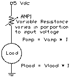 One way in which to get a larger driving capacity out of this method of PWM is to connect the unloaded PWM output to some type of linear amplifier like an audio output amp. This works well and eliminates the problem with the limited drive capacity of the TICkit as well as the "glitches" when the TICkit is in between cycles() functions as the program executes. The problem with this method is that it is very power in-efficient. When the output of the amplifier is mid-way between ground and max voltage output, the difference between the max voltage and the output must be dissipated by the amplifier. This generates a lot of heat and wastes a lot of power. The following diagrams show the amplifier arrangement and compare it to a variable resistor.