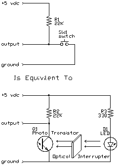 The diagrams show an encoder circuit and how an optical index is created. The LED is continuously lit and an optical interrupting fixture is connected to the rotating shaft so that only one position interrupts the beam. When the interrupting is not in place, the light turns on the photo transistor. Because the resistance of the transistor when turned on is so much lower than the 22K pull-up resistor, the output is very nearly at ground level. When the optical interruption blocks the light from the LED, the transistor turns off and has a high resistance relative to the 22K resistor. The output then is very nearly +5 vdc.