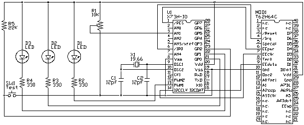 A single Xtender IC gives the system the following hardware resources: 2 CCP I/O pins, a 32 bit real-time seconds counter, 3 time bases, a unipolar stepper motor controller, 128 bytes of RAM, a buffered RS232 port, a 16 bit counter, 4 100-Hz PWM outputs, and 5 8-bit A/D channels.