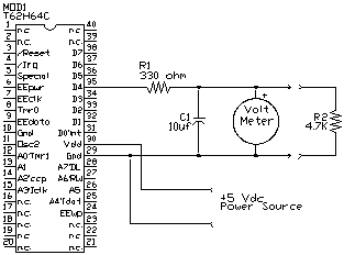 This program uses the cycles function to produce a ramping voltage between 0 and 5 vdc. The meter can be a voltage meter or an O-scope if you have one. If R2 is disconnected, the voltage repeatedly ramps up to 5 volts then ramps down to zero cleanly. With R2 in circuit, there is a relatively large spike at the end of the ramp and the ramp gets sluggish toward 5 volts. These distortions occur because R2 loads the circuit when there are program interruptions in the PWM output.