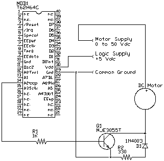This circuit controls a relatively large DC motor running at a supply voltage of up to 50 volts follows. This circuit can conceivably switch up to 5 amps with this single switching transistor and flyback diode. Realistically, however, you should only use this circuit for switching 2 amps or less. If you are going to switch higher currents, R1 should be reduced to 150 ohms. No interface components are shown in the diagram.