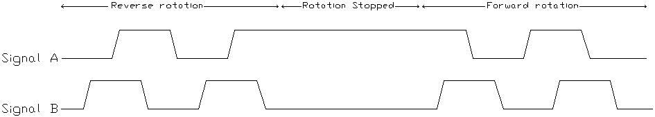 First, what is a quadrature encoding sensor. An encoding sensor is a collection of switches, either mechanical, optical, or magnetic that indicate the angular position of a shaft. These types of encoders usually have between 16 and 512 positions per revolution. Some encoders produce an absolute binary or Gray's coded position output. The one used in this example is a relative position sensor that produces a quadrature output. The output waveforms look as shown below. When the sensor rotates in one way, signal A's phase leads signal B's, when the sensor rotates the other way, signal B's phase leads signal A's. The sensor electronics need to watch these two signals to increment or decrement a counter. We assume the motor and mechanical inertia of the system prevent the signals from changing too fast. This is a reasonable assumption when the motor's output shaft is geared down. If there are more than 20 phases per second per signal, dedicated electronics are needed to count the position.