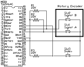 In the next example a quadrature encoding sensor is used with an index sensor to locate the absolute position of a rotating shaft. Although we won't put all the electronics for driving the motor in the schematic, these additional components could easily be incorporated with a motor driving circuit like those talked about earlier.