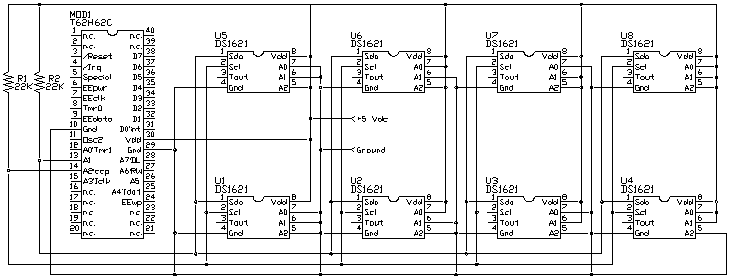 Notice that the two lines used for the I2C bus are pulled high. This is required by the I2C protocol because multiple sources can drive both the clock and data lines. Also notice how the pins A0, A1, and A2 on each DS1621 are strapped for a different address. This is how each IC knows which I2C address to respond to. The 'A' pins allow the designer to specify 3 of the 7 I2C address pins. The other four are hard coded by the manufacturer of the IC. Some ICs internally specify all 7 address lines and must be ordered with different address (like the Xtender) if more than one will be used on an I2C bus.