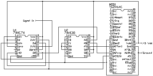 Measurement of RPM or the time between repetitive events is simple. In the last example, the time base could only be counted while the signal input was high and during the first cycle following the rising edge of that signal. By eliminating one of the AND gates, the time base is counted during the entire first cycle following arming. By taking the reciprocal of the time, we have the RPM. Doing the reciprocal requires a bit of mathematic manipulation, but nothing too hard for the TICkit. First, the revised circuit: