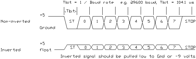 The following diagrams illustrate RS232 timing and how inverted or non-inverted signals appear on output pins.