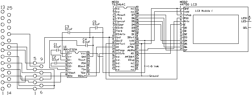 The demonstration program is as simple as the circuit. The program initializes the LCD display then displays 20 characters it receives with the rs_receive() function. The rs_send() function is used by the rs_string() function to send a message to the PC saying, "send a block beginning with 'A'". At this point, the program uses rs_recblock() to get a block of 10 characters which are prefaced with the letter 'A'. When all 10 characters are received, the string is displayed on the LCD. The process is repeated indefinitely