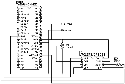 There are two approaches to interfacing the LTC1298/SP8538. The first approach uses general purpose pins to create the serial data and clock signals required to read the voltage on the input pins of the A/D. The second uses a section of hardware within the TICkit 62 called the Synchronis Serial Port (SSP) and generates the same serial data and clock pattern at a much faster rate.